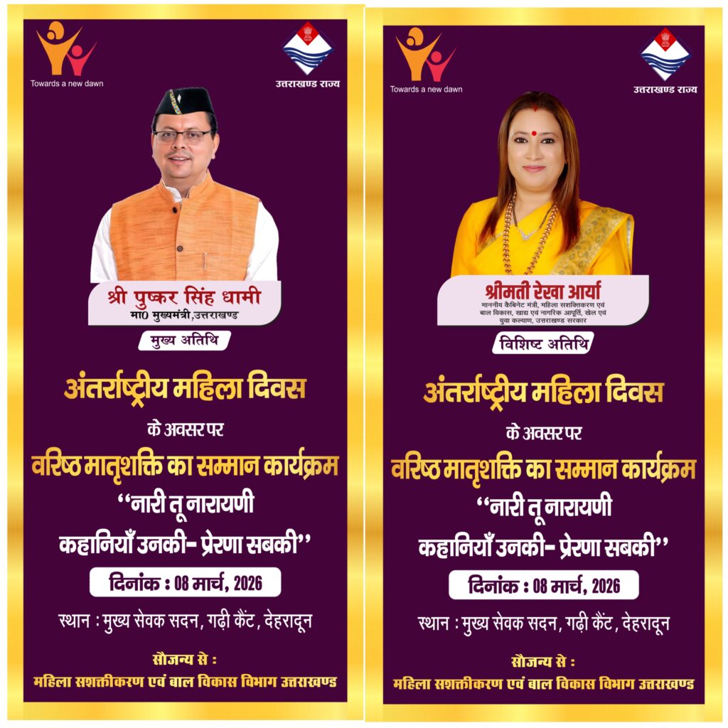 घर से ही शुरू होगा महिला सशक्तिकरण : रेखा आर्या राज भवन में विभिन्न क्षेत्रों में उत्कृष्ट प्रदर्शन करने वाले हुए सम्मानित देहरादून:- अंतर्राष्ट्रीय महिला दिवस के अवसर पर राजभवन स्थित लोक भवन में आयोजित महिला कल्याण उत्कृष्ट सेवा सम्मान एवं ‘मेरी पहचान–2026’ कार्यक्रम में विभिन्न क्षेत्रों में उत्कृष्ट कार्य करने वाले कर्मचारियों, अधिकारियों और सरकारी योजनाओं के लाभार्थियों को…