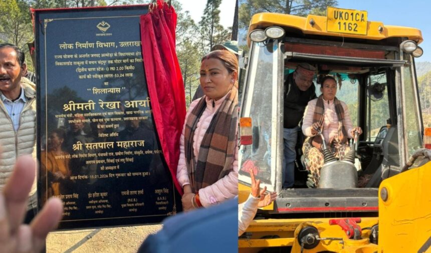 अल्मोड़ा:- सोमेश्वर विधानसभा क्षेत्र के विकासखंड ताकुला के अंतर्गत मनान से चंद्रपुर तक मोटर मार्ग के 2 किलोमीटर सड़क के नवनिर्माण कार्य का आज भूमिपूजन किया गया। कैबिनेट मंत्री रेखा आर्या ने स्वयं जेसीबी चलाकर शिलान्यास किया। इस कार्य की स्वीकृत लागत 53.04 लाख रुपये है।
