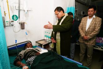 क्वानू–मीनस मोटर मार्ग दुर्घटना में घायल यात्रियों का हाल पूछने दून अस्पताल पहुँचे मुख्यमंत्री धामी।